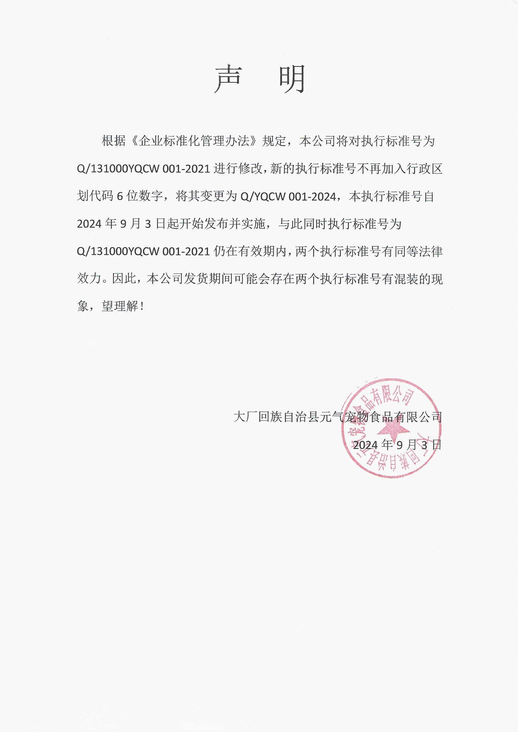 关于执行标准变更声明
